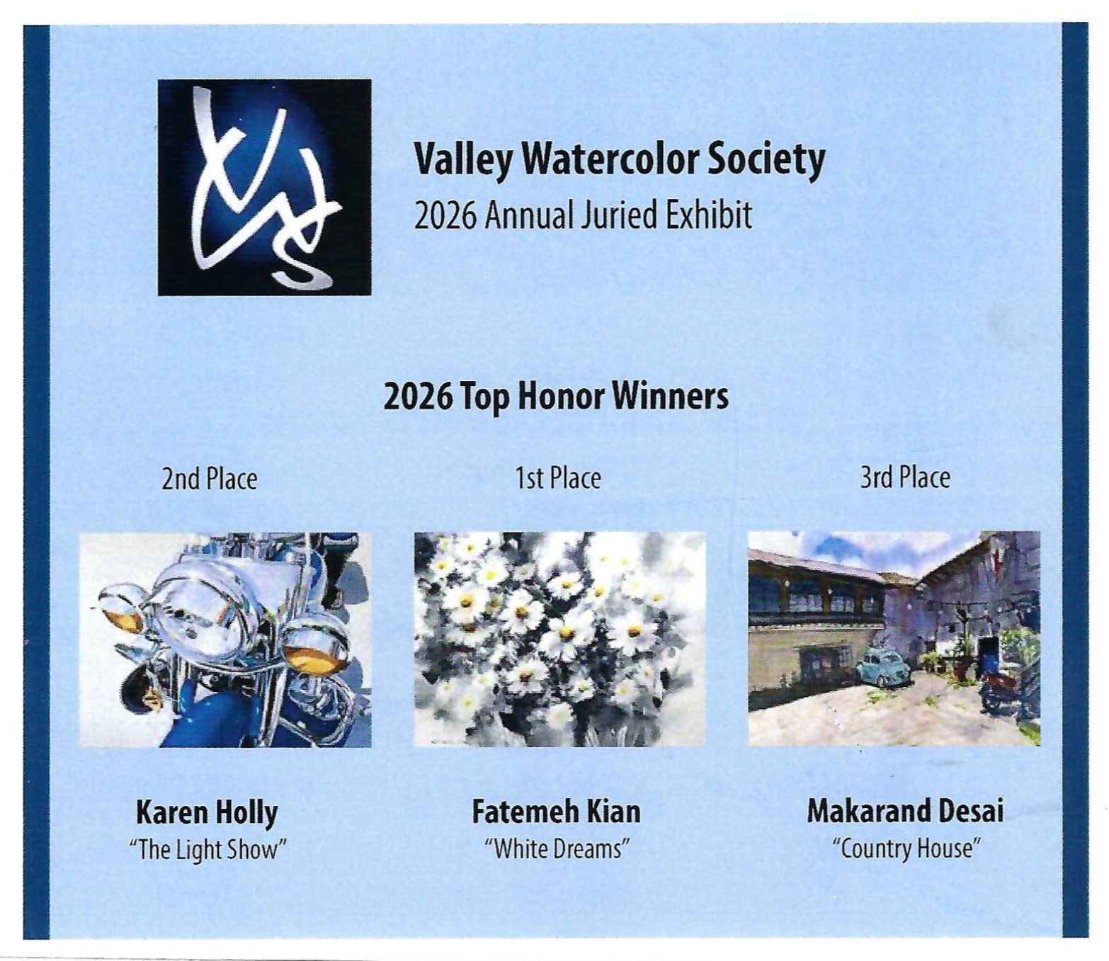 Annual Exhibit Each year, Valley Watercolor Society hosts an Annual Juried Exhibit with rotating judges over the years. To see works for each year’s exhibit, click the link below: 2026 2025 202420232022202120202019201820172016 For questions, suggestions, or to volunteer, email Sylvia Crosbie